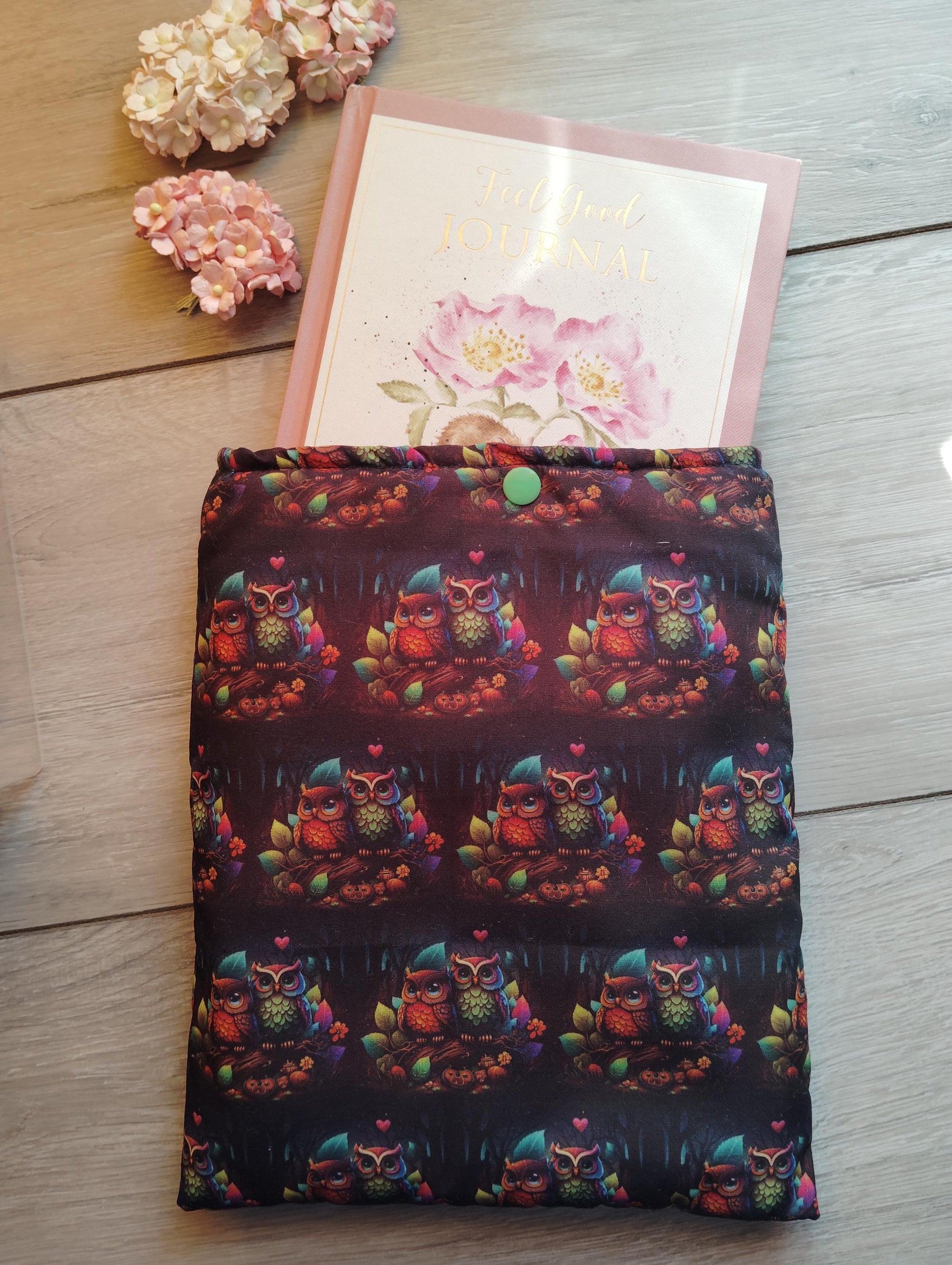 Discover the perfect blend of style and functionality with our beautifully designed book sleeve, ideal for protecting your favorite reads or tech devices. Crafted from durable polyester fabric on the outside and soft cotton on the inside, with wadding and batting to give it it's padding, this cover not only safeguards your book or tablet but also adds a touch of elegance to your collection. The charming mystical owl couple design makes it a delightful addition to any reading nook, while the spacious interior accommodates various sizes, ensuring your items stay safe and stylish wherever you go.