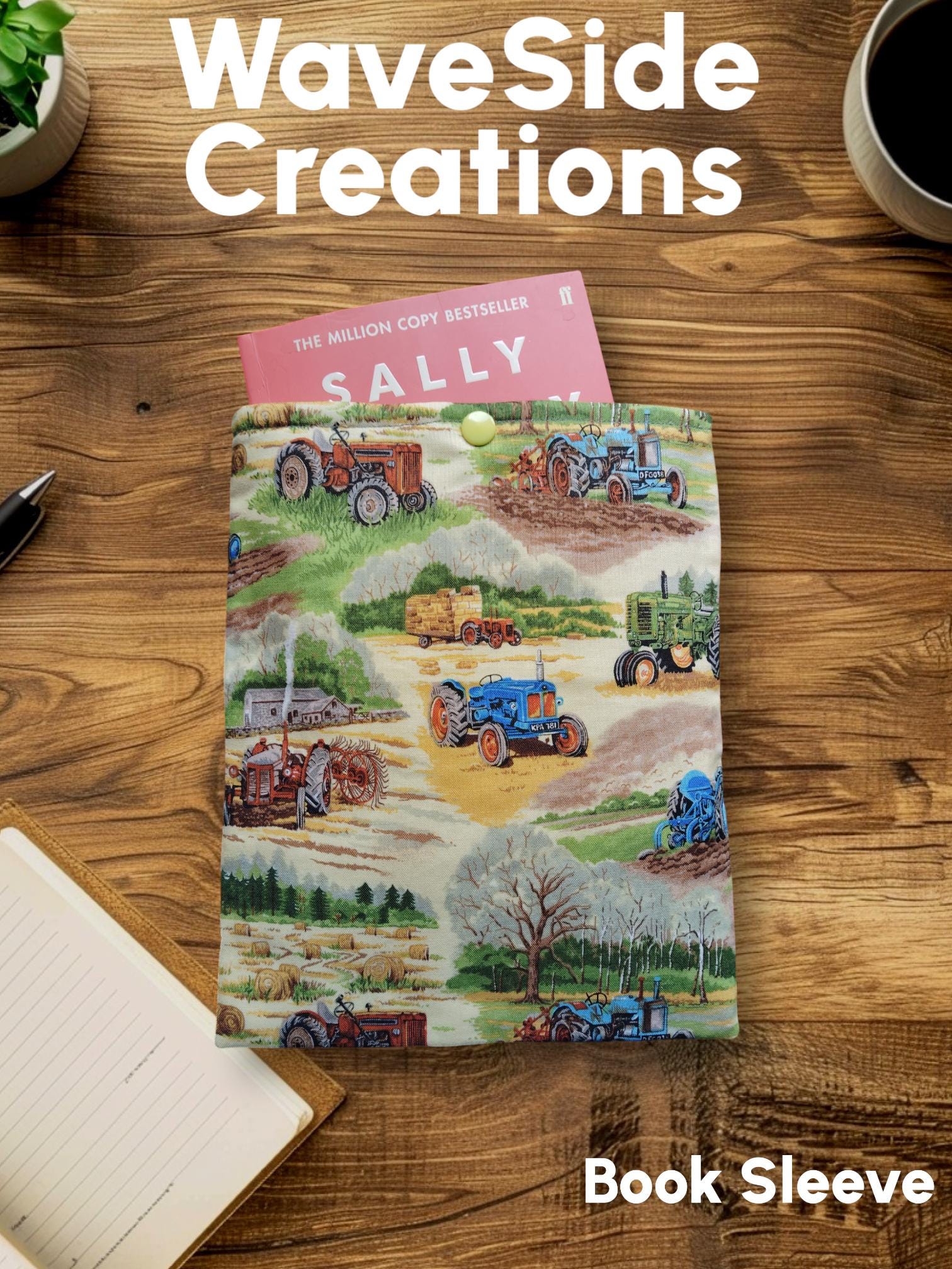 Discover the perfect blend of style and functionality with our beautifully designed book sleeve, ideal for protecting your favorite reads or tech devices. Crafted from durable cotton fabric on the inside and out, with wadding and batting to give it it's padding, this cover not only safeguards your book or tablet but also adds a touch of elegance to your collection. The charming tractor design makes it a delightful addition to any reading nook, while the spacious interior accommodates various sizes, ensuring your items stay safe and stylish wherever you go.