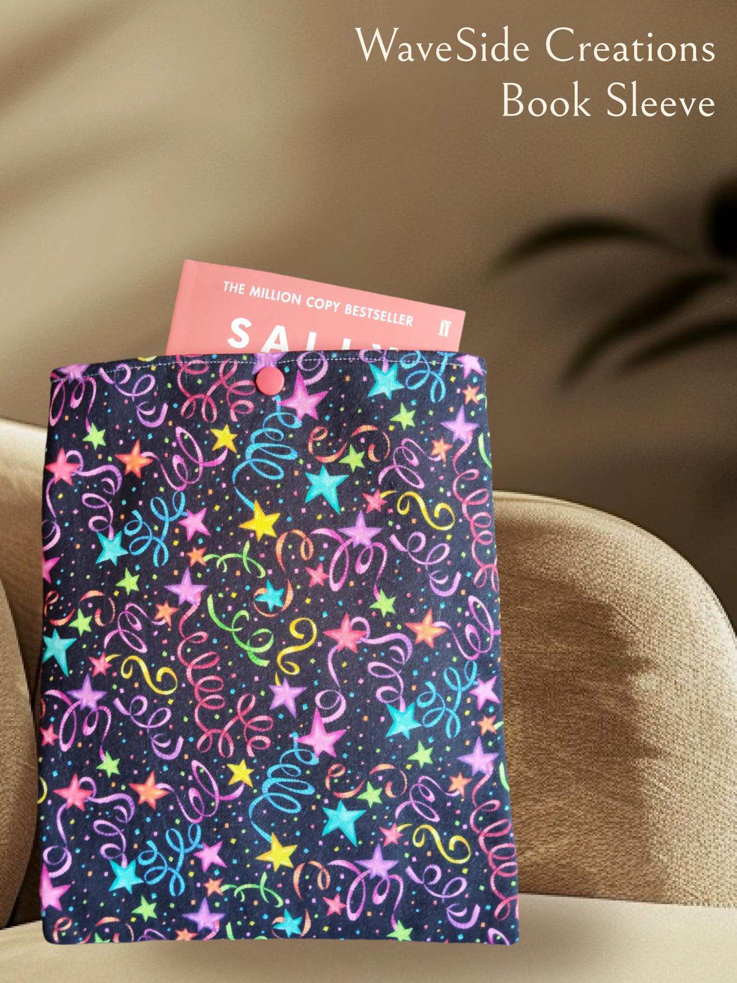 Book Sleeve, book cover, book protector, tablet cover, kindle cover, celebration theme, streamers and stars